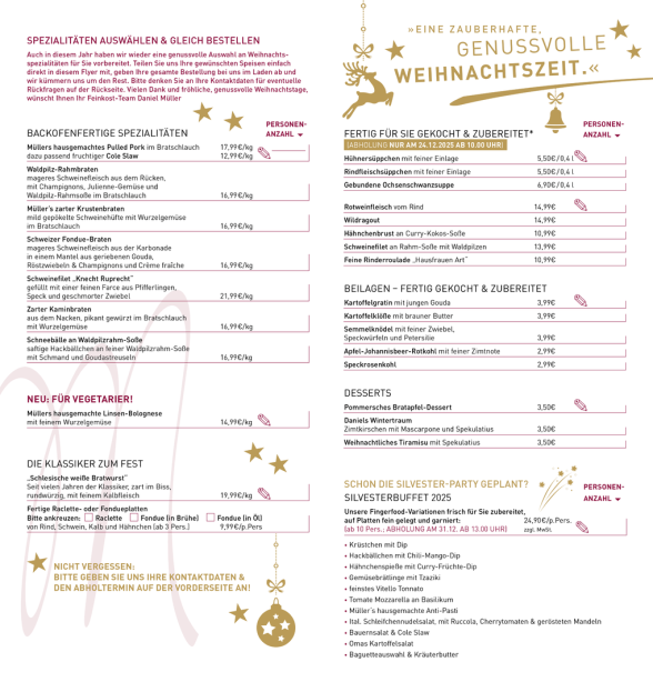 Schauen Sie sich unseren Menüvorschlag an – Müllers Silvesterbuffet 2025 mit feinsten Fingerfood-Variationen, frisch für Sie zubereitet, auf Platten fein gelegt und garniert.