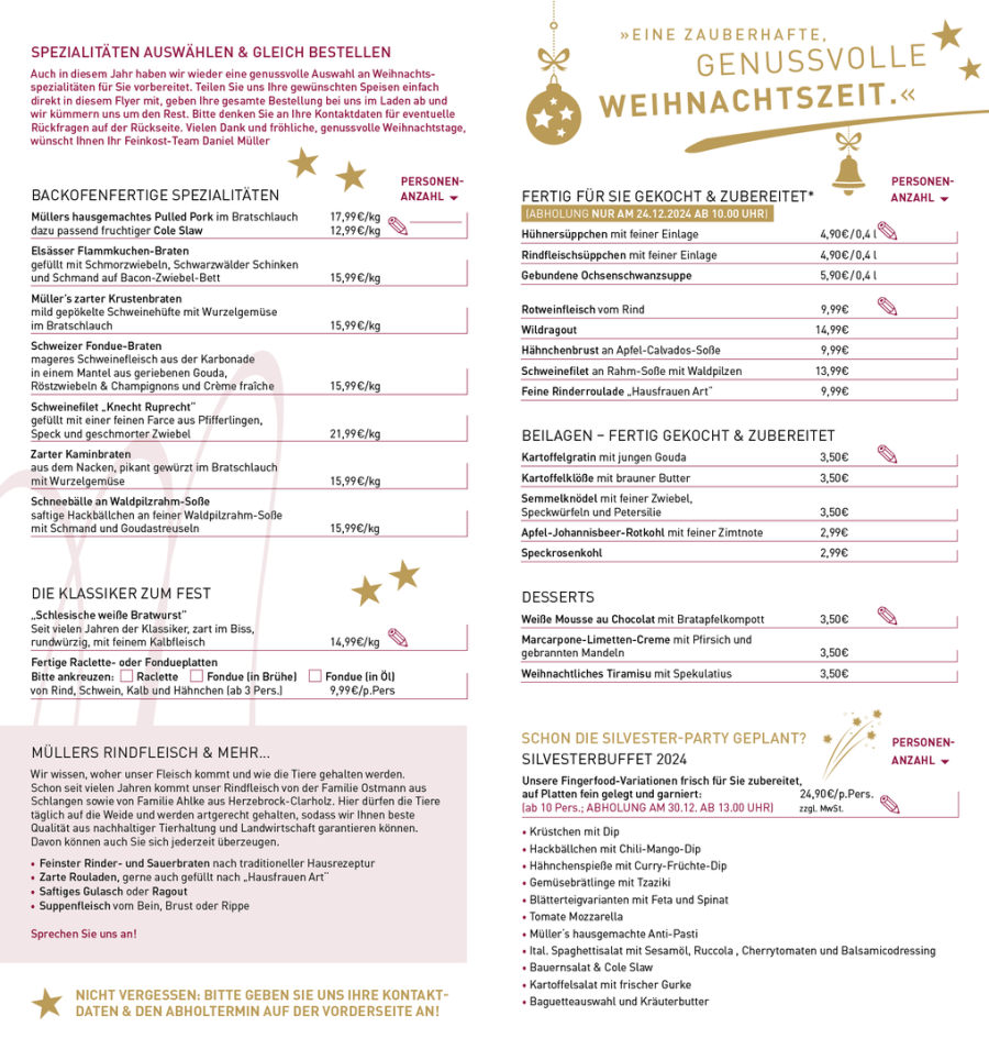 Auch in diesem Jahr haben wir wieder eine genussvolle Auswahl an Weihnachtsspezialitäten und ein feines Silvesterbuffet für Sie vorbereitet.