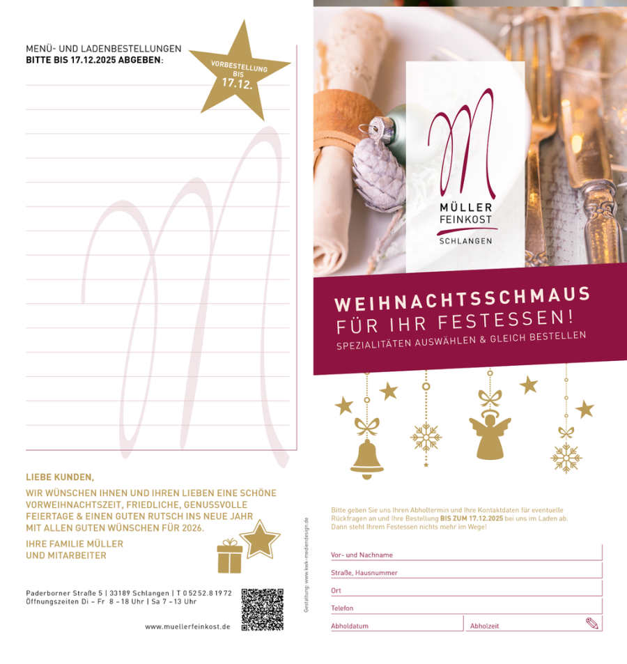 für Sie vorbereitet. Teilen Sie uns Ihre gewünschten Speisen einfach direkt in unserem Flyer mit, geben Ihre gesamte Bestellung bei uns im Laden ab und wir kümmern uns um den Rest.
